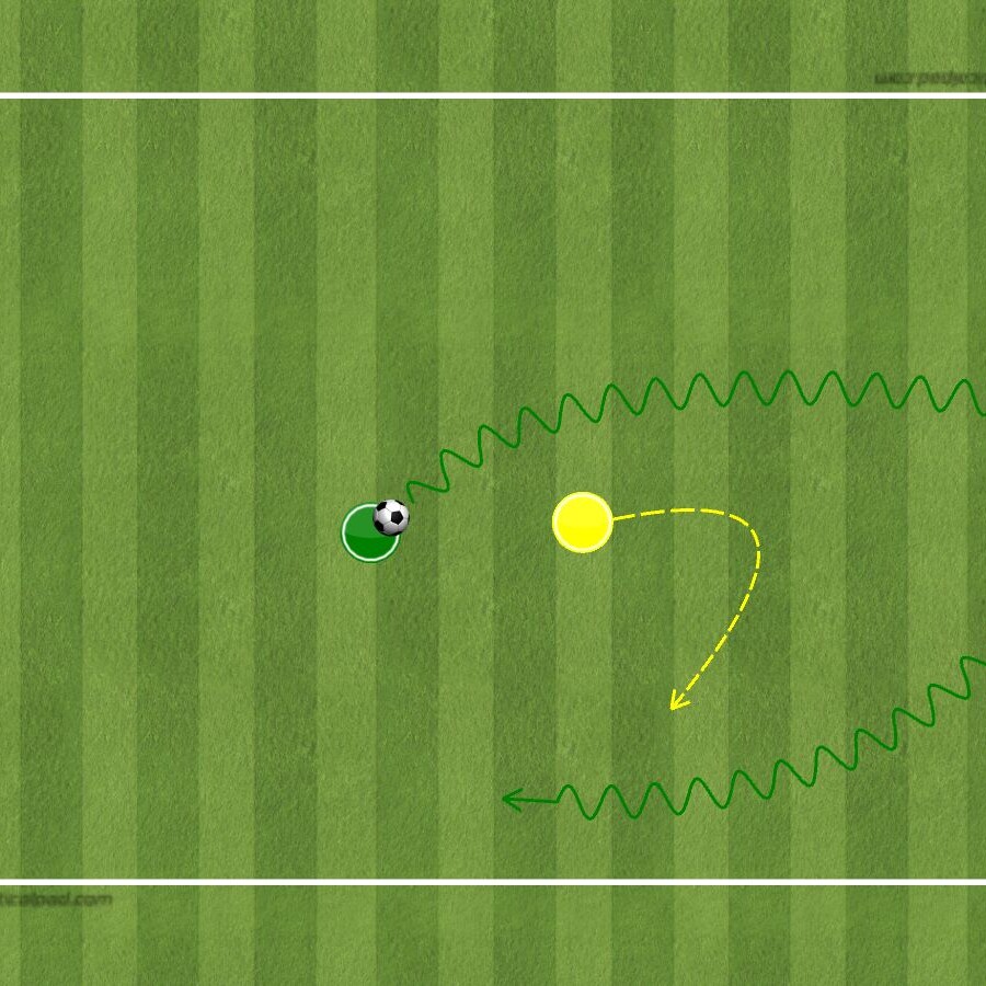 Sei giocatori p, ognuno con pallone, si dispongono su di un campo ridotto con porte difese dai portieri, il tecnico chiama due giocatori che lasciano la palla e corrono all’interno del campo a…