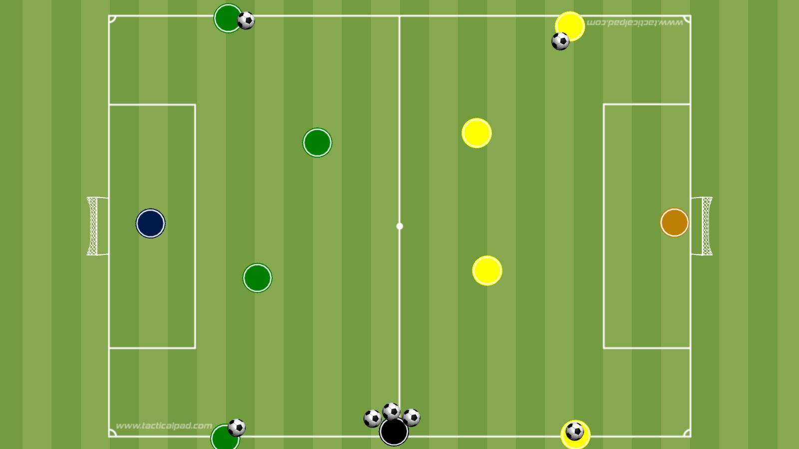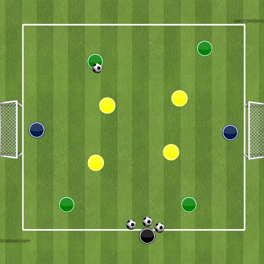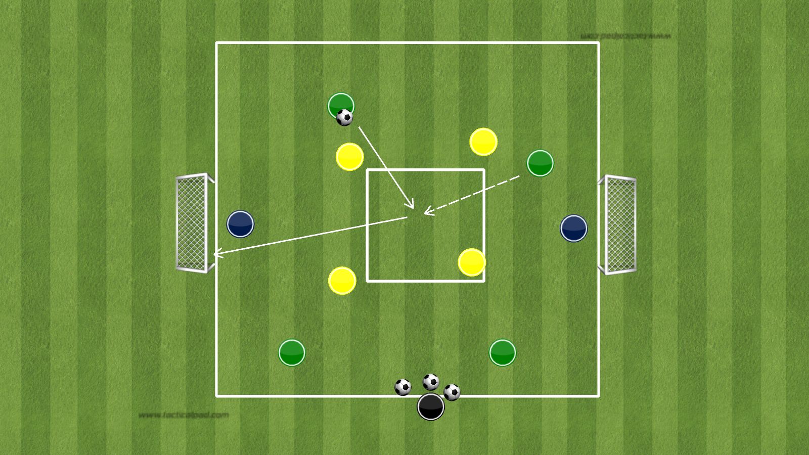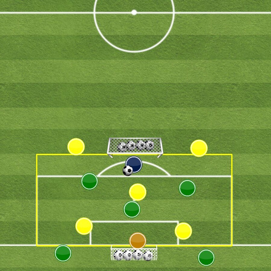 In uno spazio quadrato di dimensioni ridotte, una squadra gioca un possesso palla col supporto dei due portieri con obiettivi che possono essere diversi (10 tocchi, combinazione di gioco dedinita…) e…
