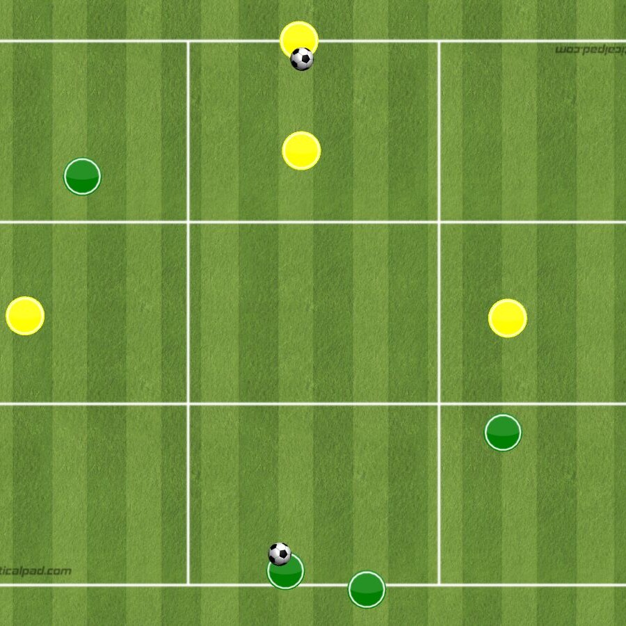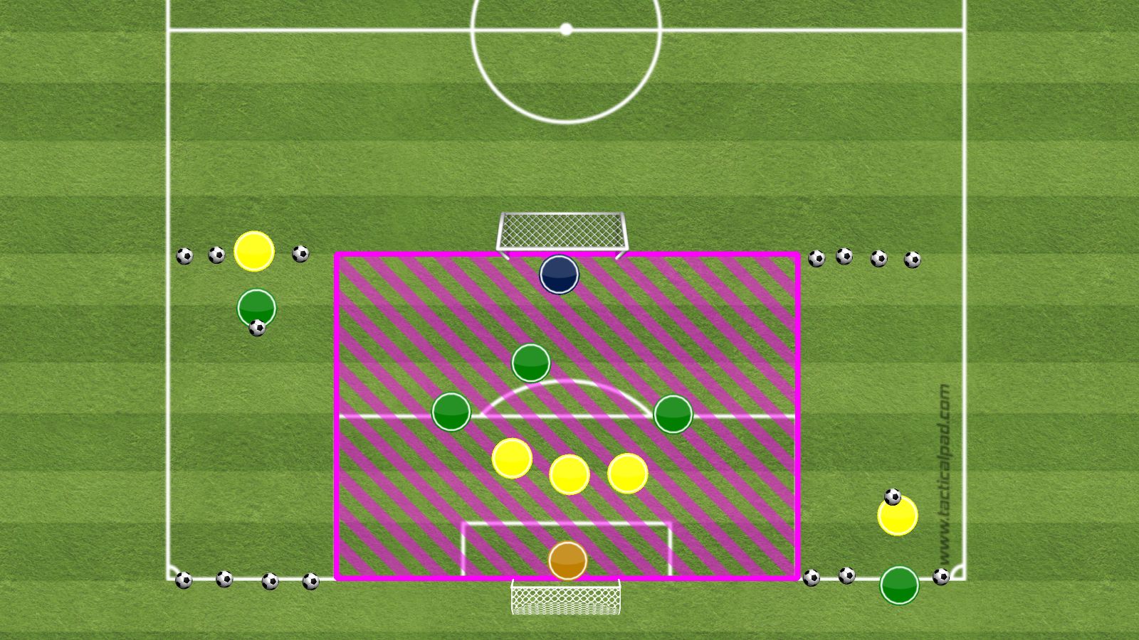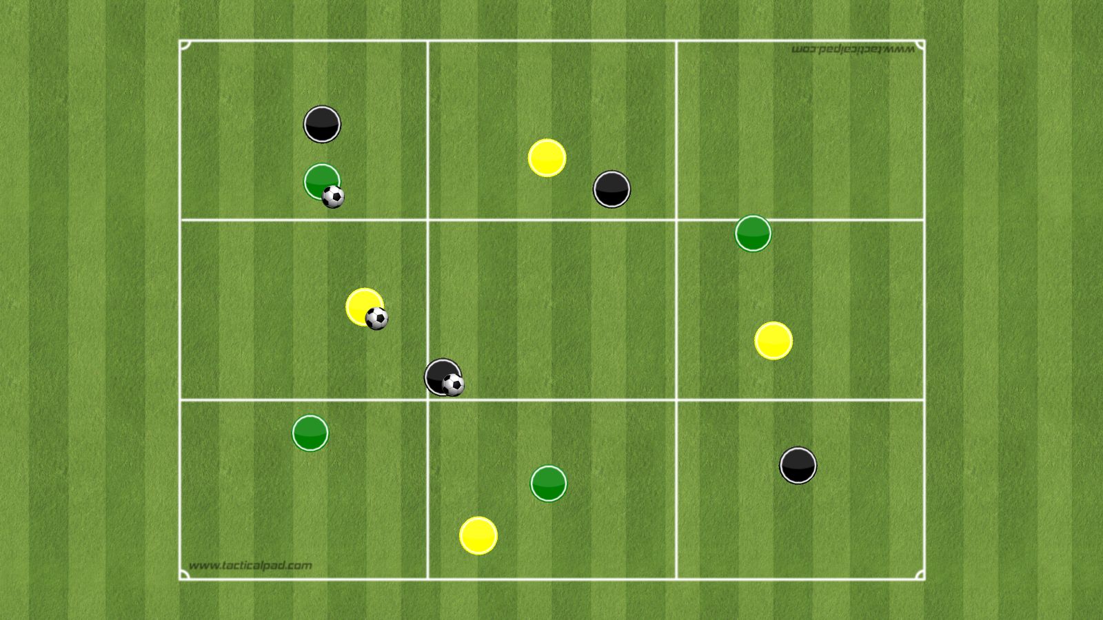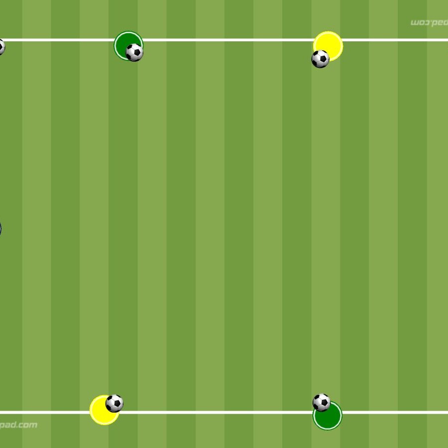 In uno spazio quadrato di dimensioni ridotte, una squadra gioca un possesso palla col supporto dei due portieri con obiettivi che possono essere diversi (10 tocchi, combinazione di gioco dedinita…) e…