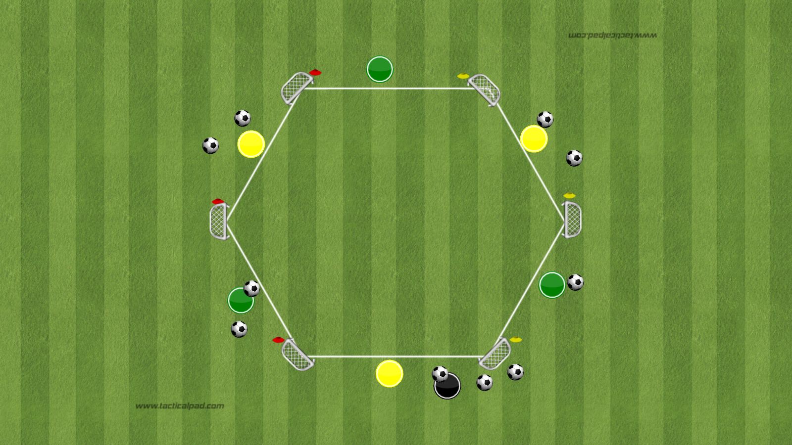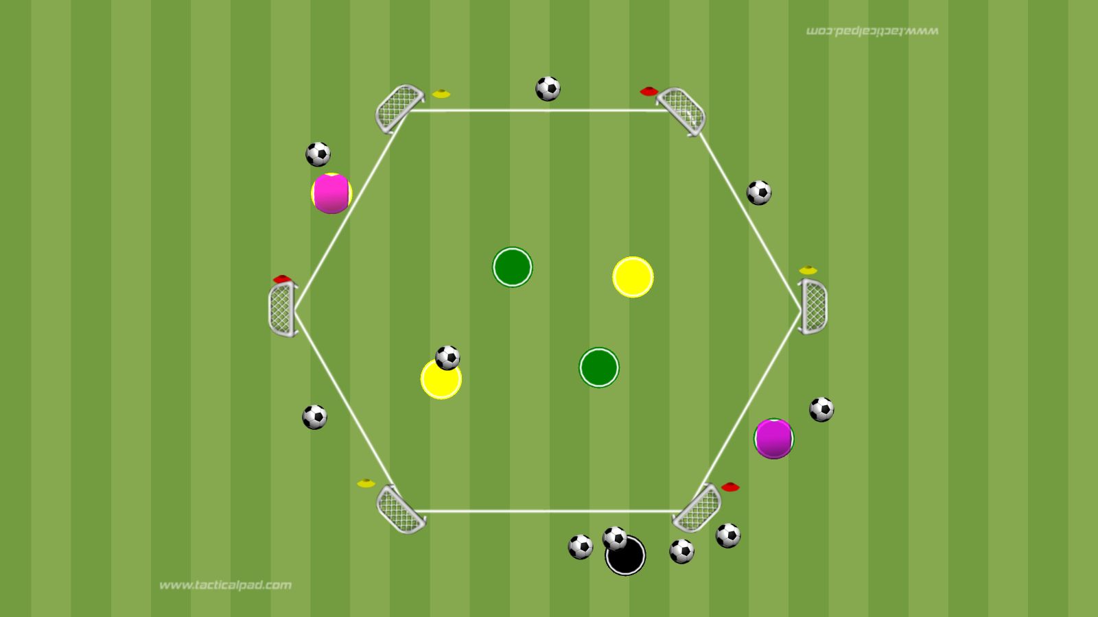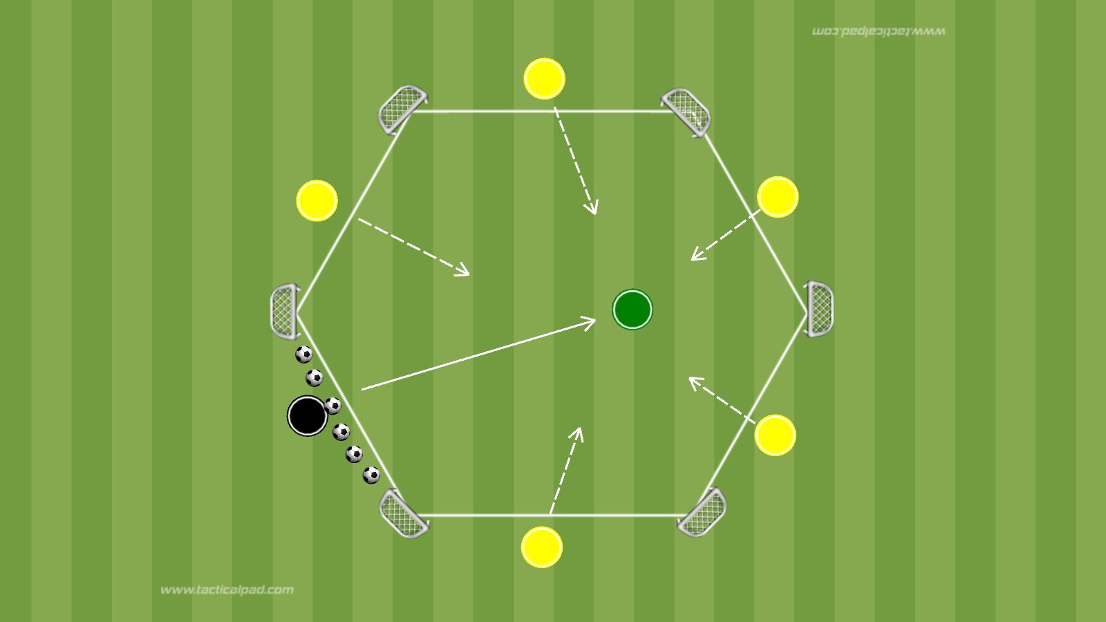 In questa sfida individuale si parte da una situazione uno contro cinque come in figura, con il giocatore centrale che riceve palla per segnare in una delle sei mini porte disposte ai vertici della…