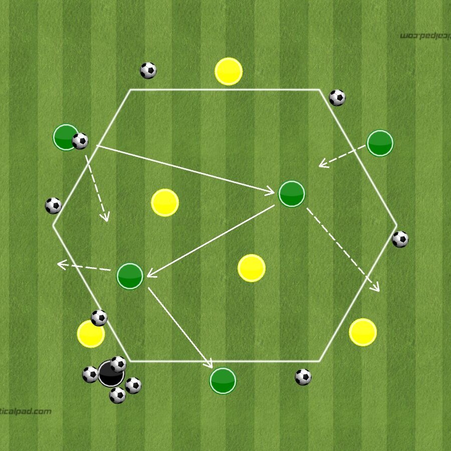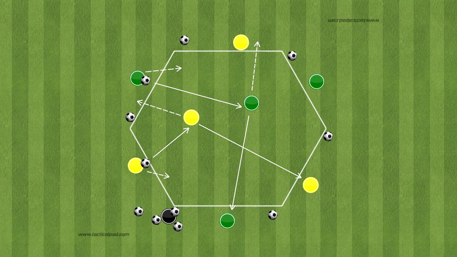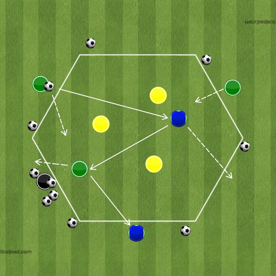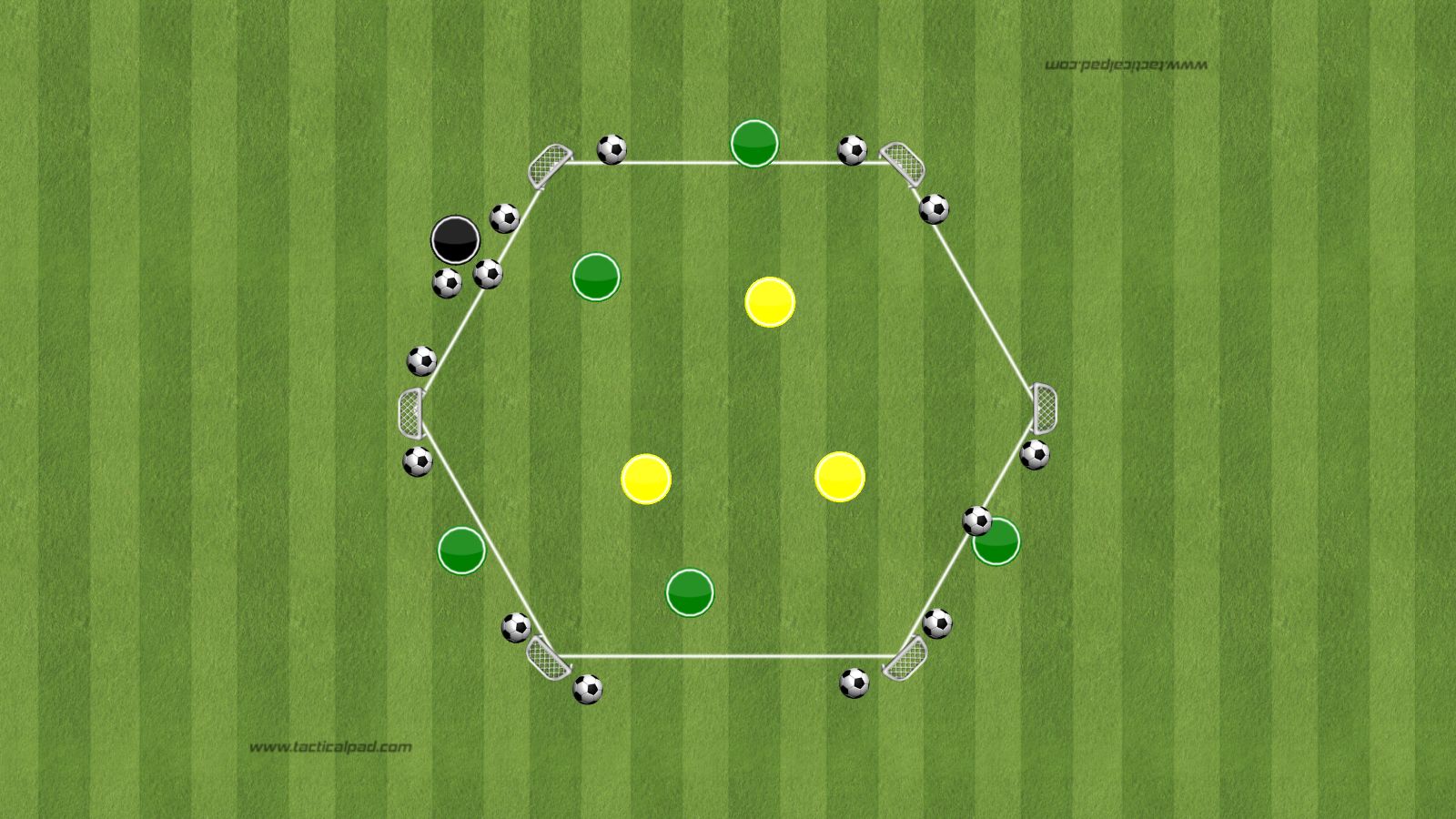 In questa sfida individuale si parte da una situazione uno contro cinque come in figura, con il giocatore centrale che riceve palla per segnare in una delle sei mini porte disposte ai vertici della…