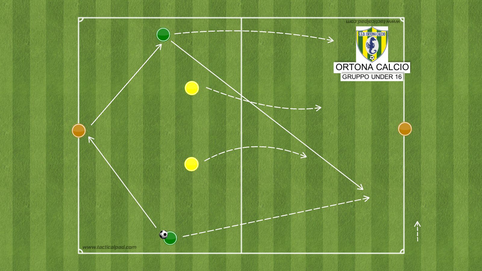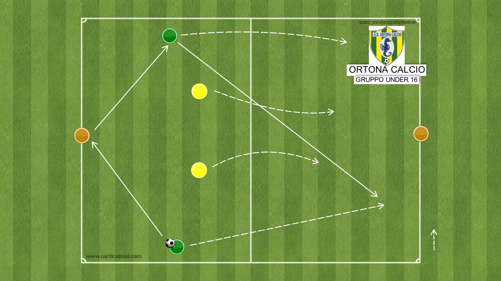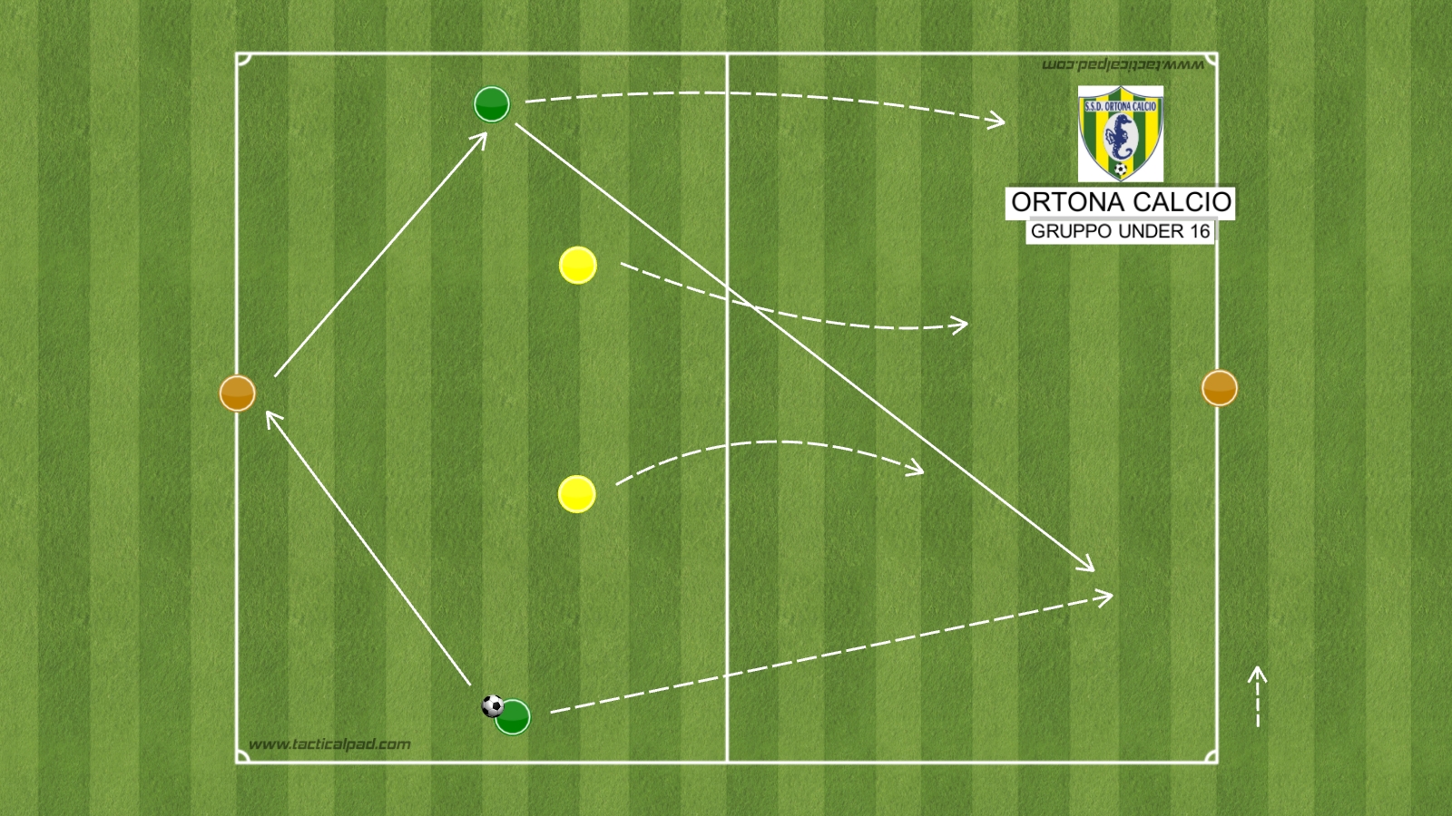 A questo punto, tutti i giocatori, senza soluzione di gioco, si spostano nello spazio dove ora si trova la palla e continuare il 2+1v2 assiame all’altra sponda.