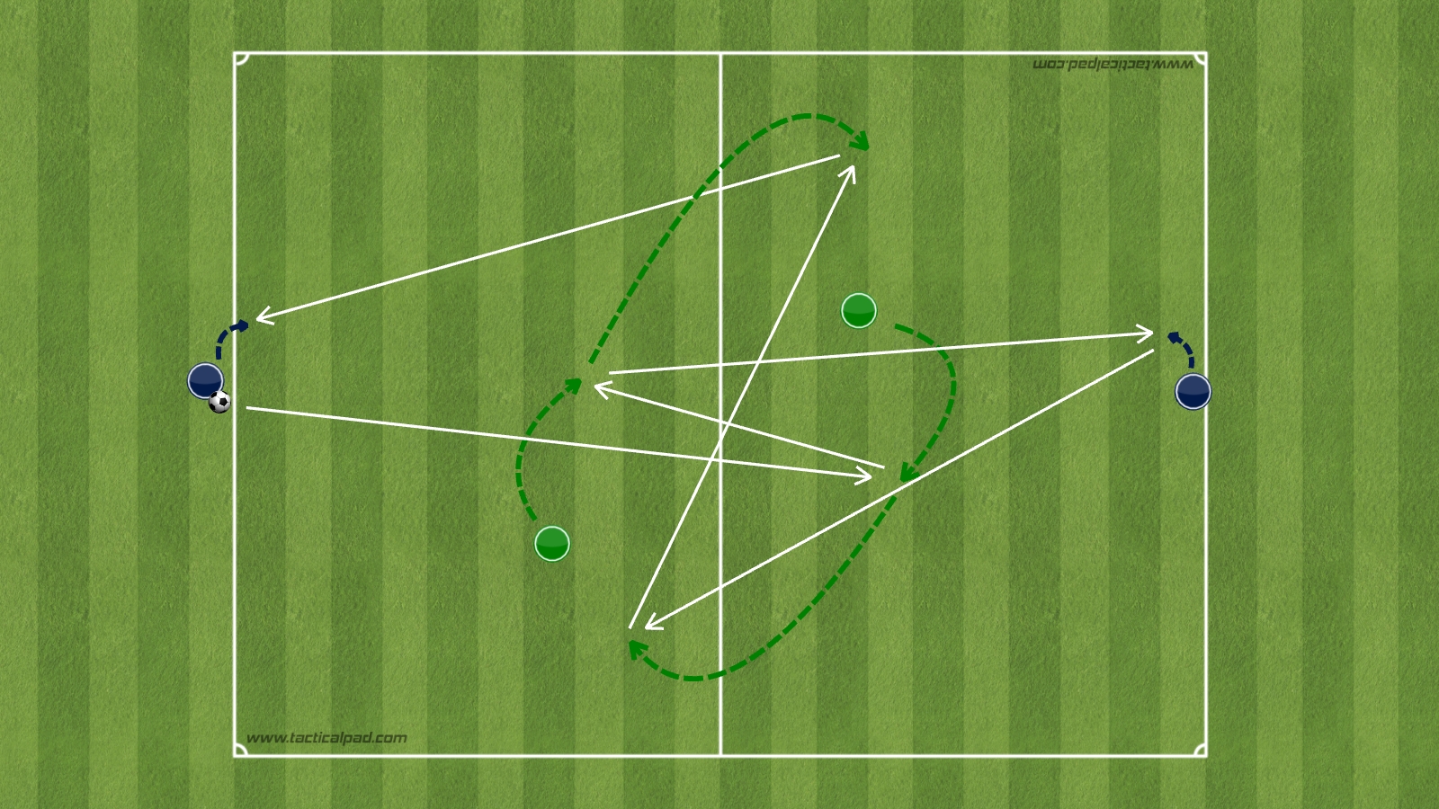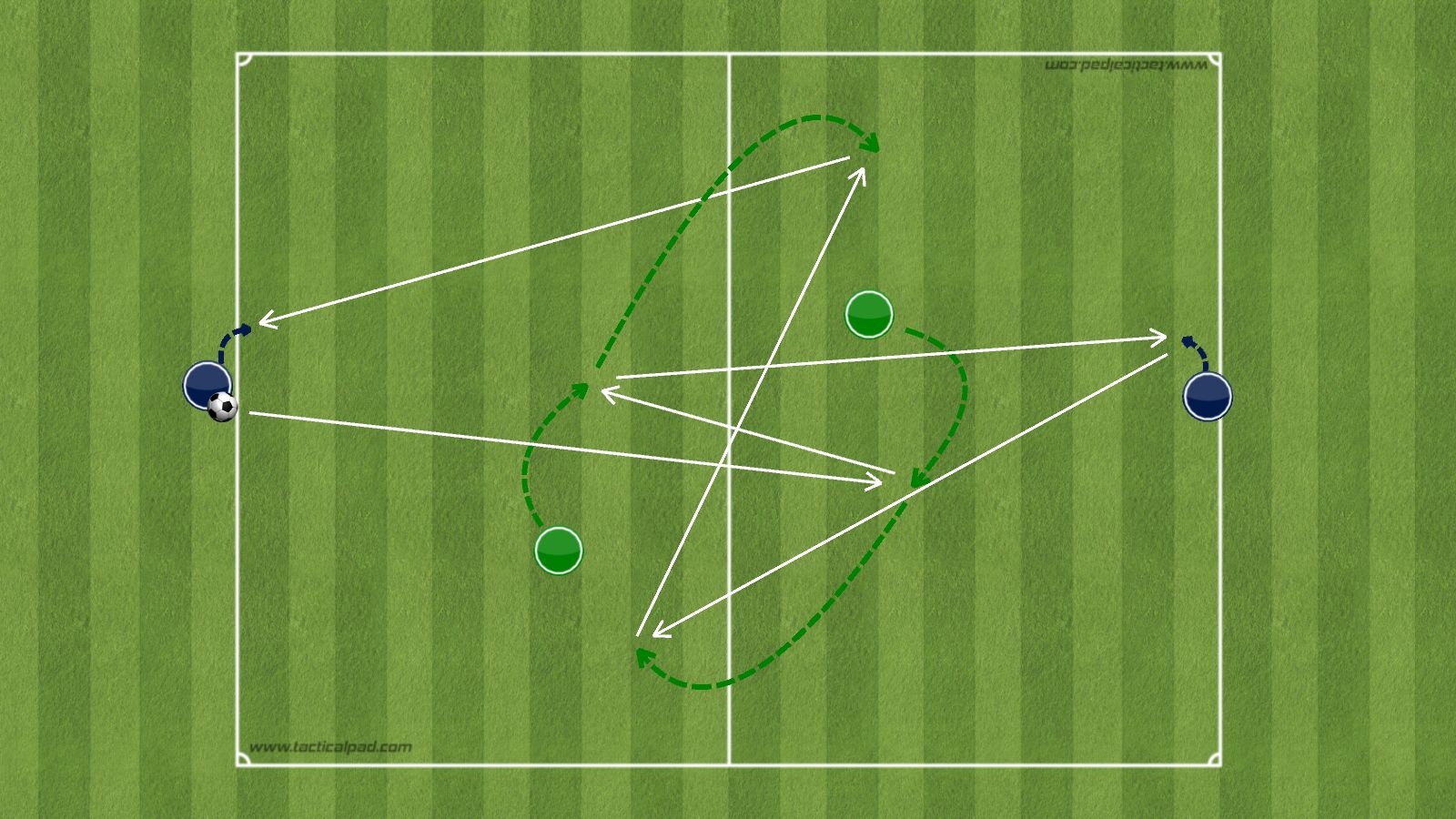due giocatori sulle linee di fondo di un doppio campo e due giocatori al suo interno (uno per metà campo) effettuano continue combinazioni lungo-corto di prima come da figura (e ritorno) con il vincolo per i due giocatori all’interrno del campo di spostarsi nell’ltra metà dell’area di gioco ogni volta che toccano la palla.