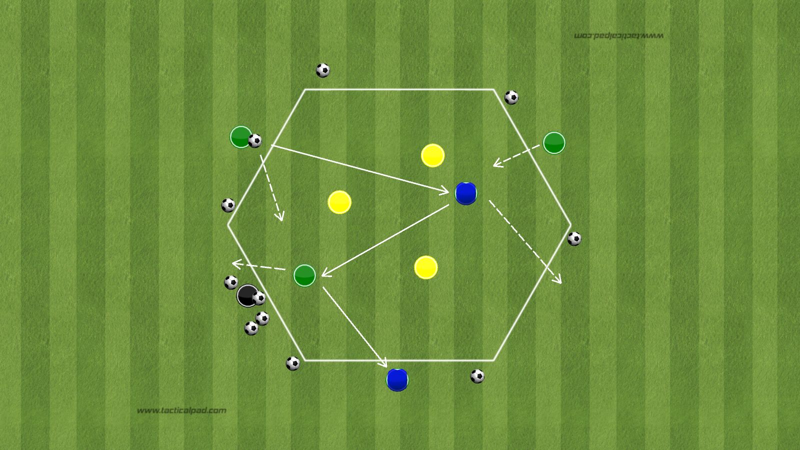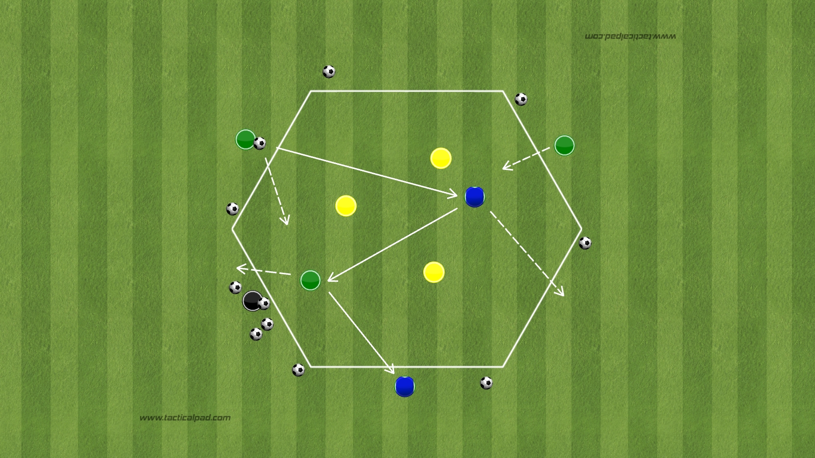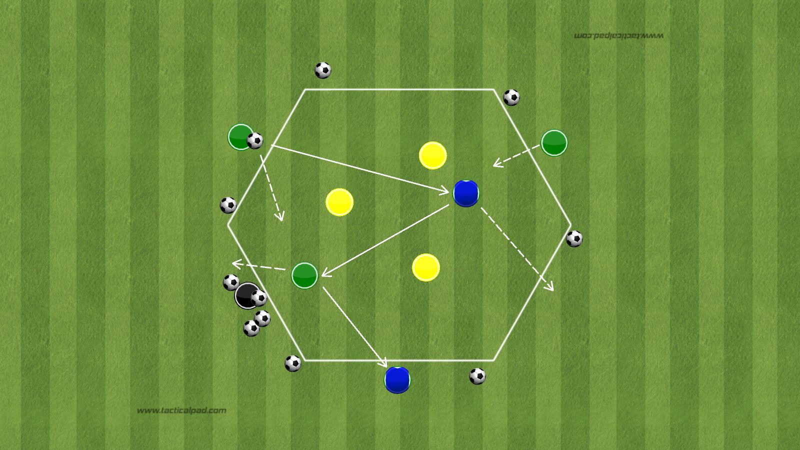 Varianti- si può giocare 2v2+2 con la disposizione tre giocatori in possesso sul perimetro dell’esagono ed uno dentro con un uno contro due all’interno dello spazio di gioco mantenendo gli stessi vincoli - per i gruppi più piccoli si può iniziare il gioco con le mani (utilizzando un vincolo di tempo, 1-2 secondi) e proporre le prime combinazioni su spazio esagonale come attività propedeutica